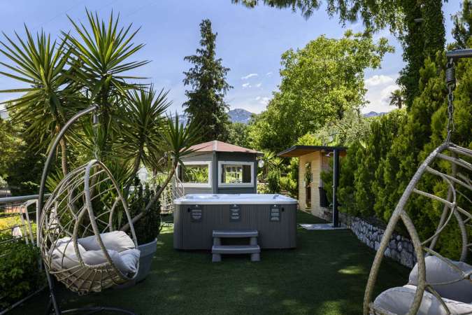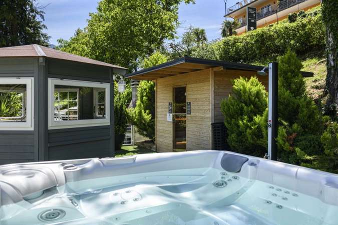 Lo spazio wellness esterno accoglie una sauna, ideale per rigenerare corpo e mente, e una vasca idromassaggio Hotspring a 6 posti, perfetta per rilassarsi avvolti dal calore e dal movimento dell’acqua.